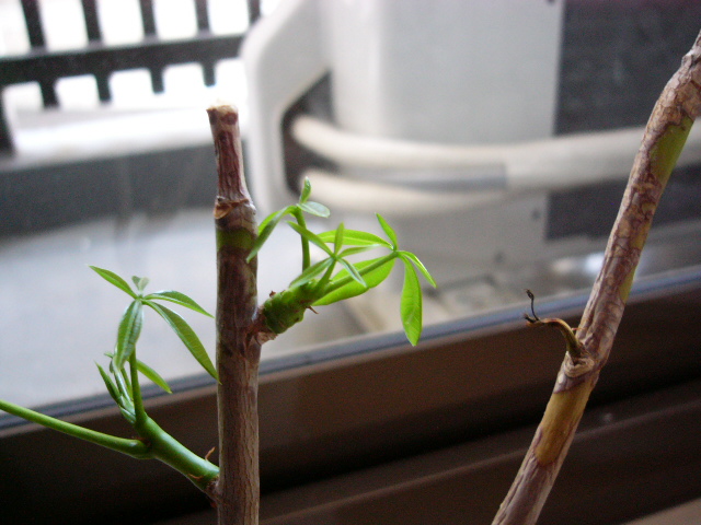 元気な方のパキラちゃんの木、大きさはあまりかわりませんが、新しい芽が開きました♪